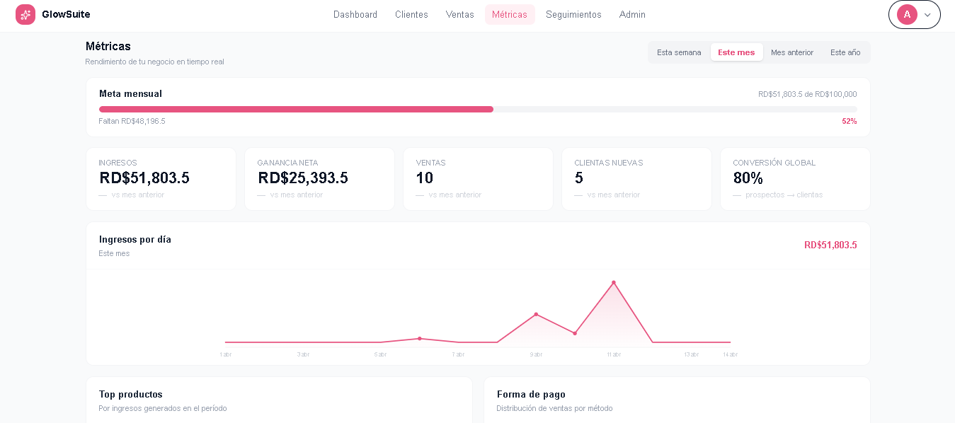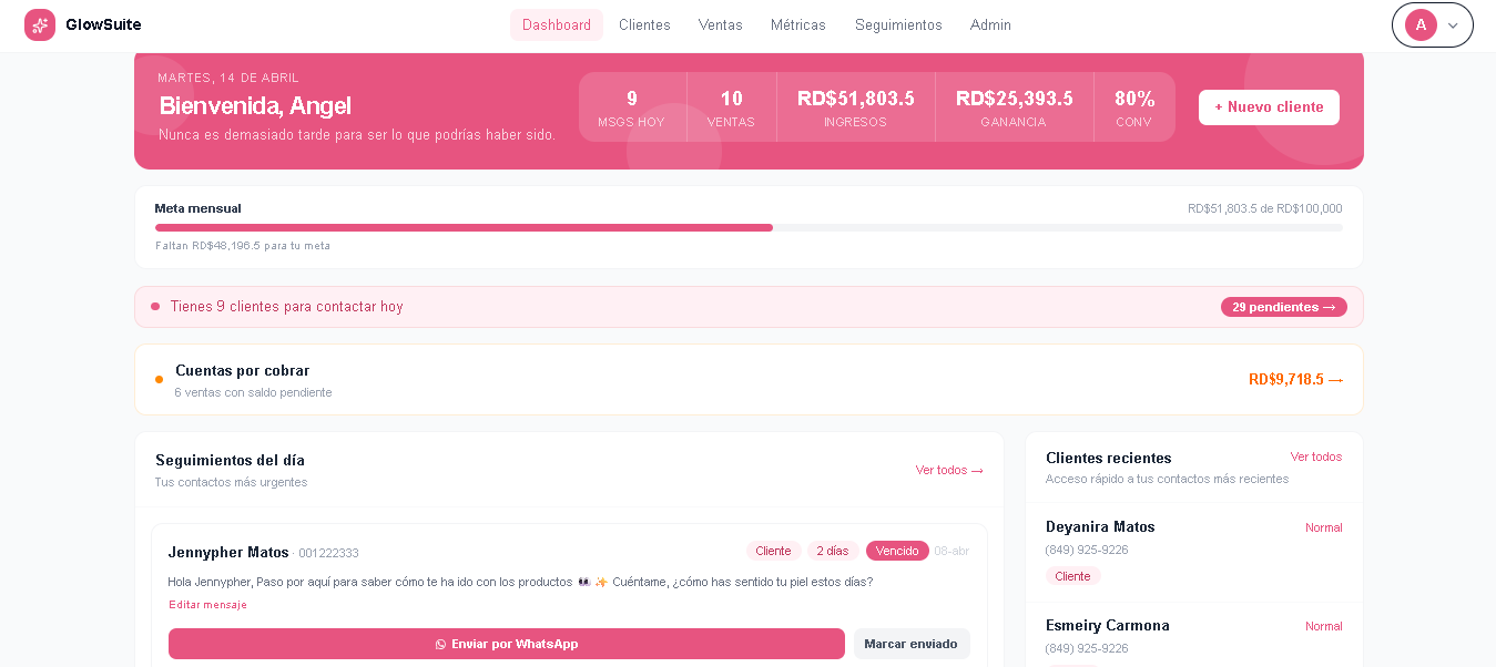 Cada día, GlowSuite CRM te dice a quién escribirle, qué cobrar y cómo va tu negocio. Tú solo das el siguiente paso.