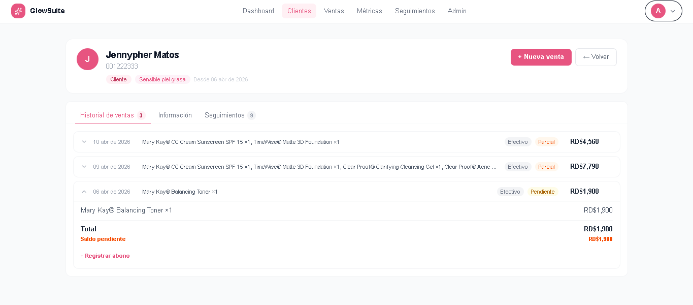Prospectos separadas de clientas activas. Historial completo de cada una — productos, compras, conversaciones pasadas.