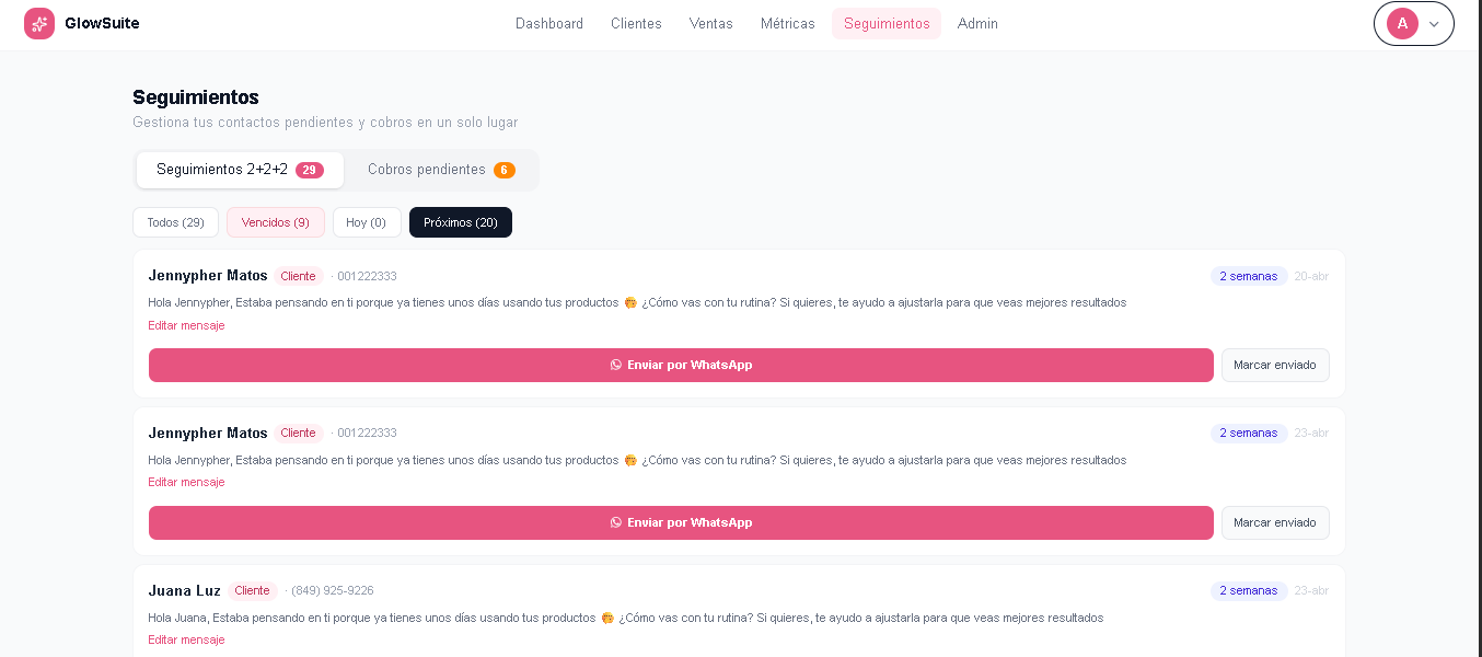 GlowSuite CRM elimina el caos de manejar tu negocio desde mil maneras distintas. Seguimientos, cobros y clientas — todo en un solo lugar, sin complicaciones.